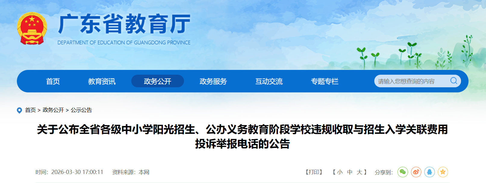 为大力开展中小学阳光招生专项行动,推动《广东省教育厅关于进一步规范普通中小学招生入学工作的指导意见》等招生政策落实,推进中小学招生领域突出问题整治,切实规范招生入学秩序、维护教育公平,现向社会公众公布全省各级中小学阳光招生、公办义务教育阶段学校违规收取与招生入学关联费用投诉举报电话。