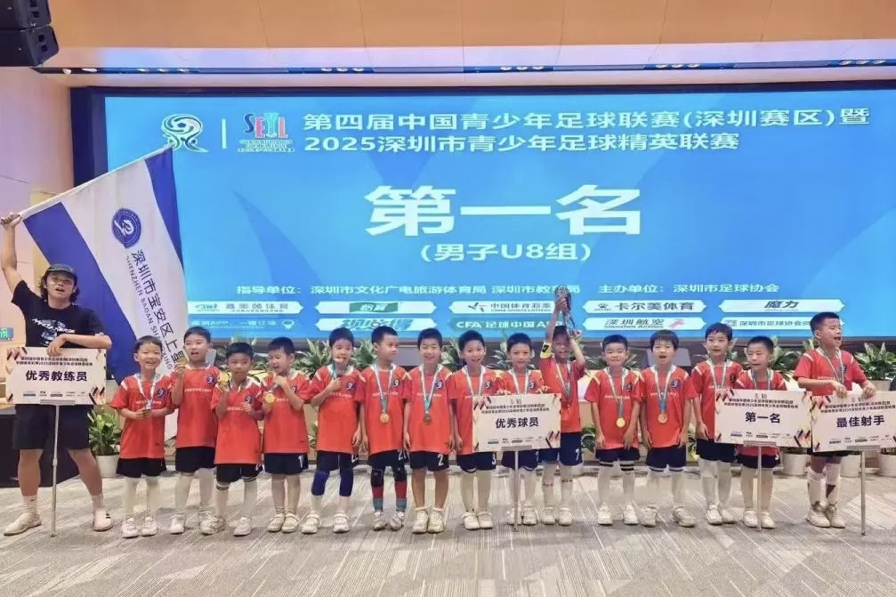 学校每周开设一节40分钟的足球课,普及全体学生;社团训练每天组织一场30分钟的对抗赛,以锤炼学生的技能。由此,打通了“课程普及+球队赛事+青训培养”的良性竞赛循环。学校还打造15人组成的“足球名教头”团队,深耕人才培养沃土。建校五年来,校队累计斩获各级各类奖项100余次,包括2025年中国青少年足球联赛(深圳赛区)U8组冠军、深圳市中小学生校园足球比赛乙组冠军等。在这里,上星足球不止是运动,更是陪伴一生的健康习惯!