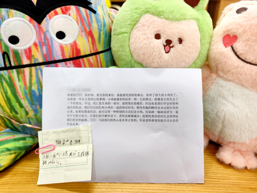 据老师回忆,她亲自将回信送达后,主动和该学生沟通,了解其心理问题持续的时间和频次。确认问题已存在较长时间后,她进一步启动干预机制,对接班主任及家长,将学生列入心理预警名单,每周定期沟通疏导。在持续跟进干预下,该学生的状态有了明显好转。