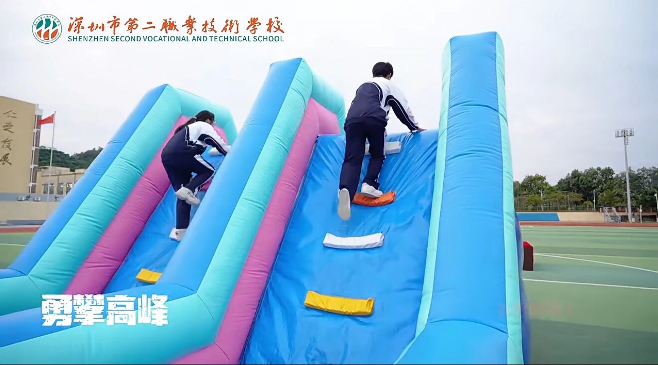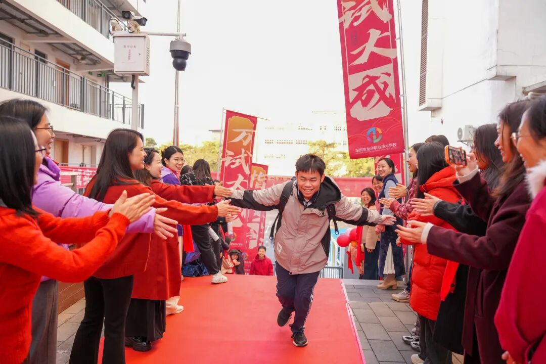 ▲在深圳市龙华职业技术学校,考生奔跑着与两侧的老师奋力击掌