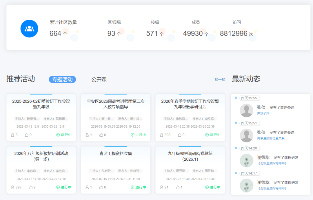 “数字教科院”已成为4.98万名宝安教师的“教研家园”,累计创建区、校级教研社区664个,开展活动超4167场,建设优质资源超50万条,平台总访问量突破878万次,形成“全员参与、全域流转、全员共创”的智慧教研新生态。