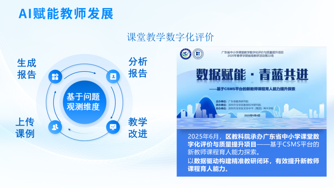 近三年,宝安区开展了课堂教学智慧评价(CSMS)研究,承办省级“5G+智慧教育”教研活动11场,实现“人人皆可研、人人皆在研”。