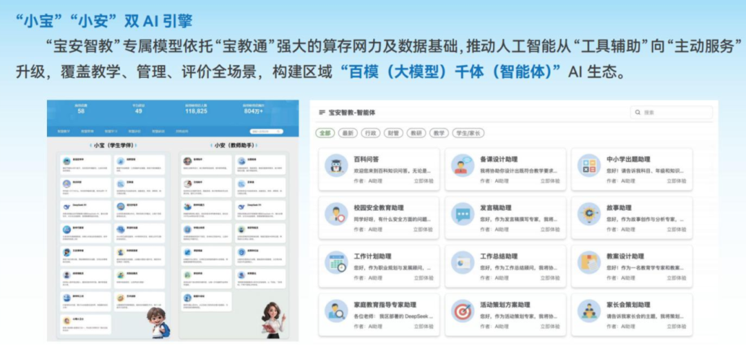 依托“宝安智教”人工智能大模型,创新推出“小宝”“小安”双智能体服务体系。“小宝”作为学生智能学伴,精准匹配学习需求,让个性化学习更高效贴心;“小安”化身教师专属数字教研员与教学助手,全程赋能教学设计、学情分析与教研改进。