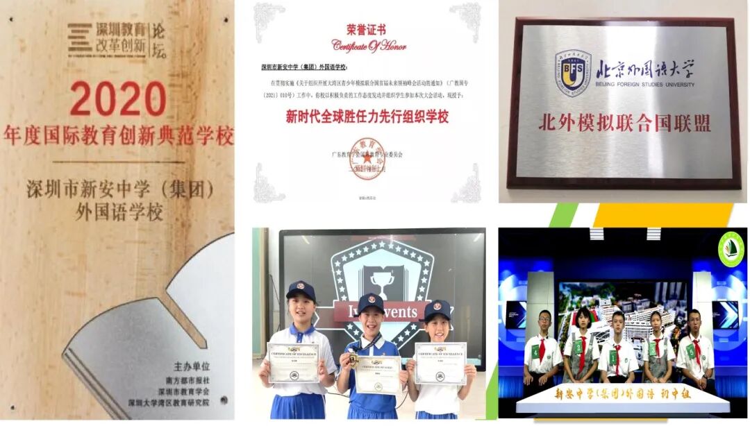 学校先后获评“深圳市年度国际教育创新典范学校”“宝安区国际化特色学校”“新时代全球胜任力先行组织学校”,并成为“北京外国语大学模拟联合国联盟校”“常春藤国际赛事优秀组织学校”与“中国声音宝安区实践学校”,体现出在区域乃至更大范围内国际化办学方面的示范性。