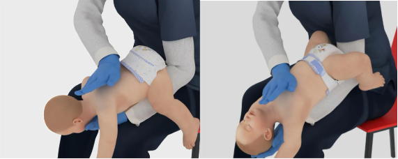 将婴儿面朝下放置于前臂,保持头低脚高位,用手稳固托住其下巴保护颈部,以掌根连续拍击肩胛骨连线中点5次,若无效,则转为胸部冲击,位置在两乳头连线中点下方,手法与婴儿心肺复苏的按压方式相同。