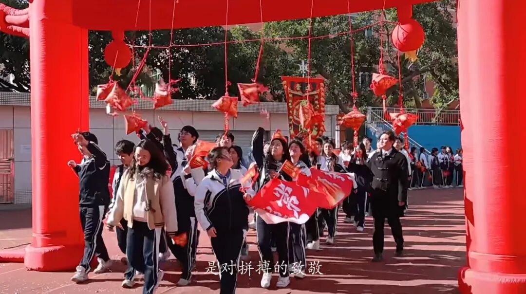 ▲在深圳市龙华职业技术学校,考生奔跑着与两侧的老师奋力击掌