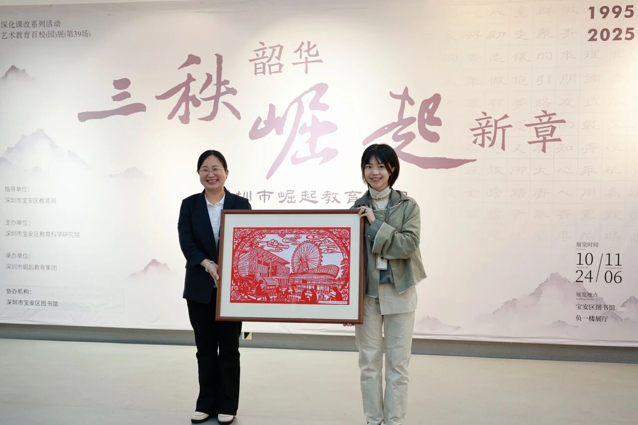 开幕式上,李晶执行副总裁代表崛起教育集团向宝安图书馆赠送了由崛起师生精心创作的剪纸艺术作品,叶雨萌副馆长接受了赠送。