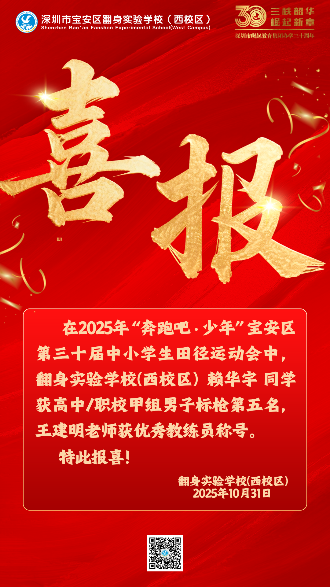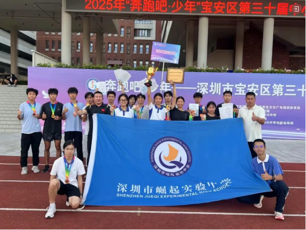 在10月26日下午结束的2025年深圳市宝安区第三十届中小学田径运动会中,崛起实验中学田径代表队与来自全区22支田径代表队展开为期四天的激烈角逐,夺得高中/职校组团体总分亚军。学校男子团体和女子团体分别荣获总分第一名和第二名,在男子4x100米接力项目上再次刷新宝安区学生运动会高中组纪录。此外,翻身实验学校(西校区) 赖华宇同学也荣获高中/职校甲组男子标枪第五名。